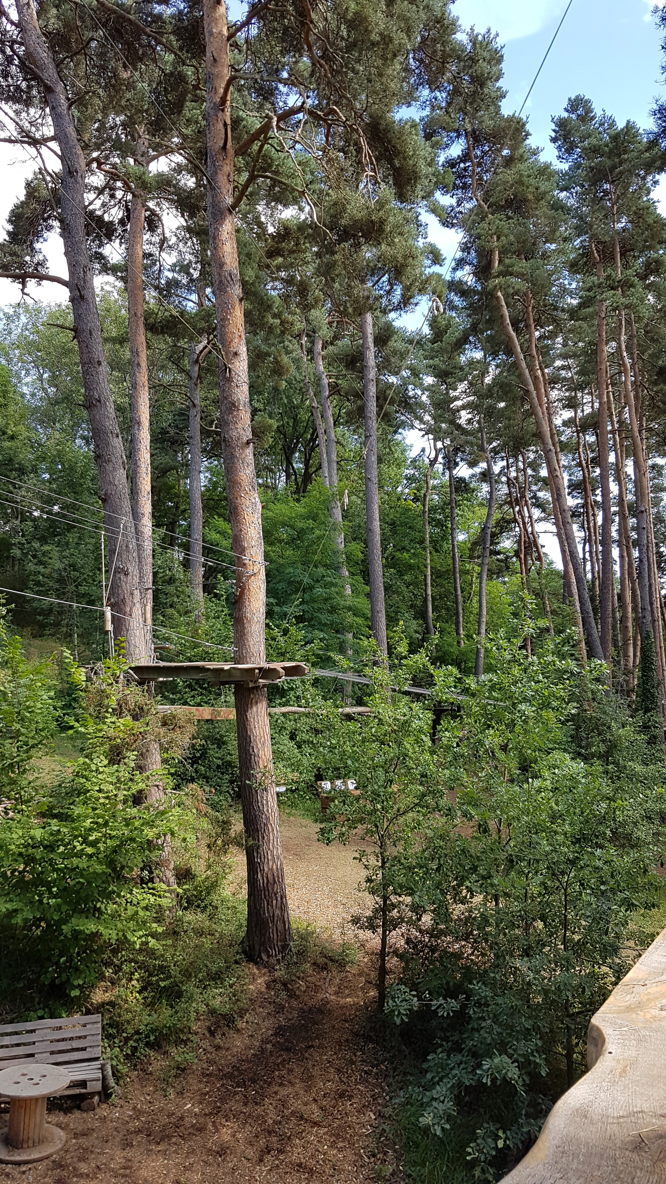 D'excellents parcours d'aventure dans un cadre agréable en face d'un château de contes de fées. Mentions spéciales pour les parcours orange et rouge et leurs tyroliennes. Le violet est original mais il bouche vite. Quelques arbres mériteraient une petite taille sur certaines tyroliennes et les chemins sont glissants quand il fait très sec. Je trouve le réseau du bois des gaulois sympa pour les plus petits mais un peu cher. Il manque peut-être des indications de taille minimale pour certains parcours. Une belle journée sportive.