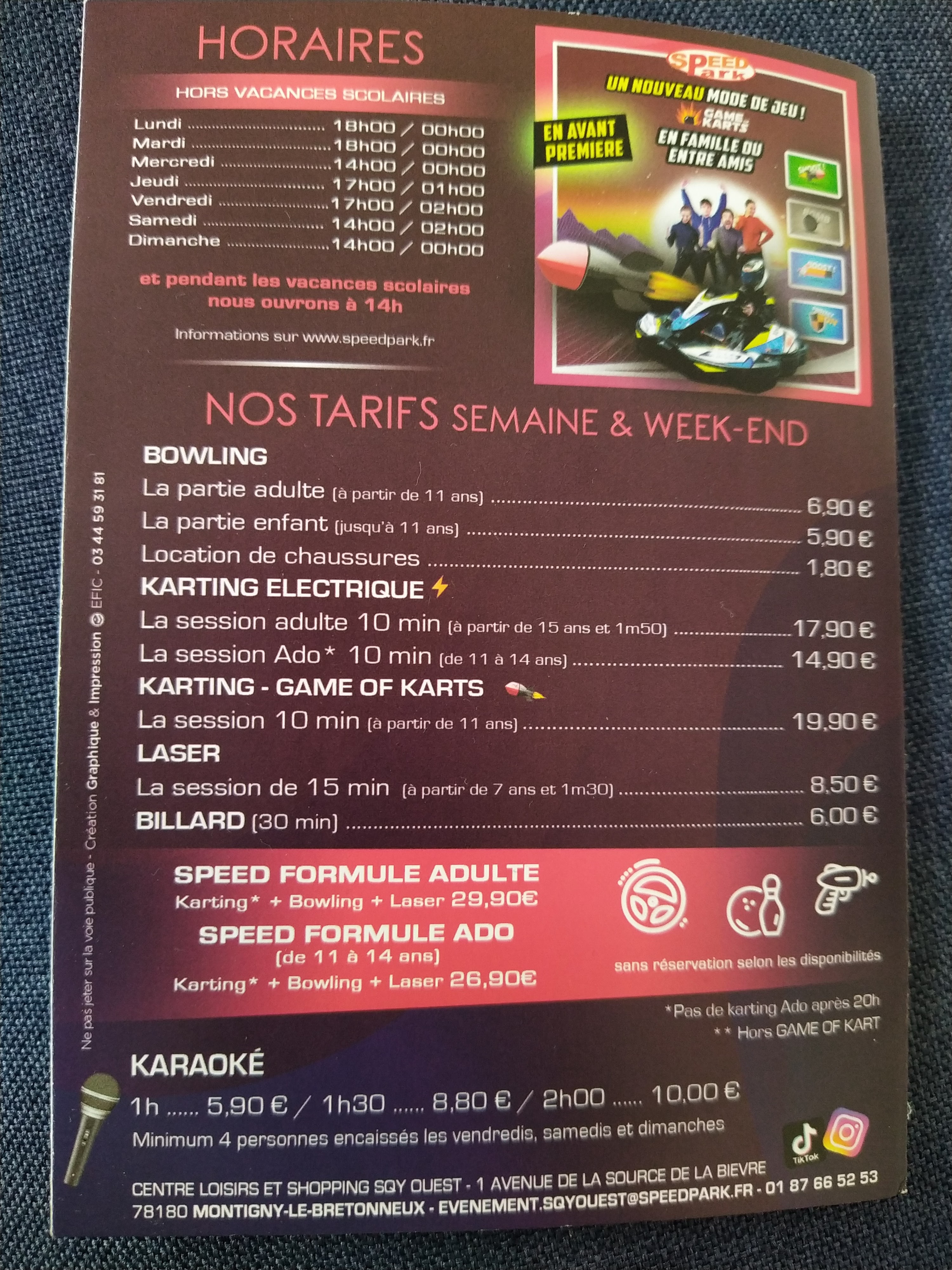Posté le 15/11/2023 à 22:01"Info sympa marqué nul part : -20% sur karting/bowlings/laser avec cartes étudiantes (en semaine). 1 partie de bowling offerte + 1 offerte toute les 10 parties avec la carte de fidélité. 👍"